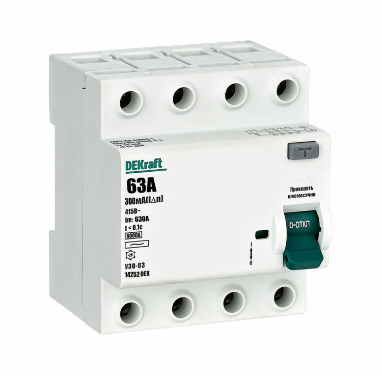 Выключатель дифференциальный (УЗО) УЗО-03 4п 63А 300мА тип AC 6кА | 14252DEK | DEKraft