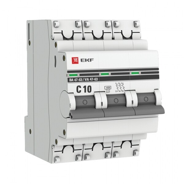 Выключатель автоматический трехполюсный ВА 47-63 10А C 4,5кА PROxima | mcb4763-3-10C-pro | EKF