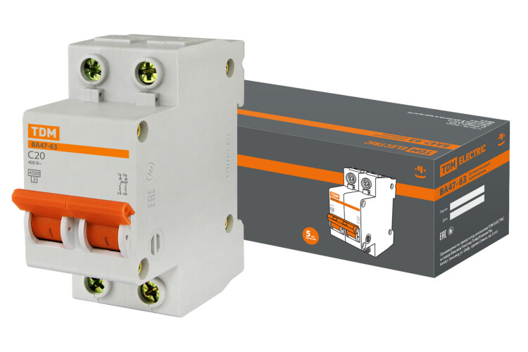 Выключатель автоматический двухполюсный ВА47-63 20А C 4,5кА | SQ0218-0027 | TDM